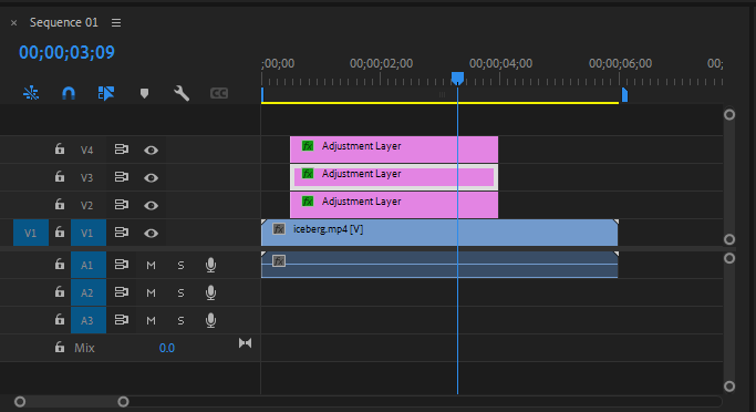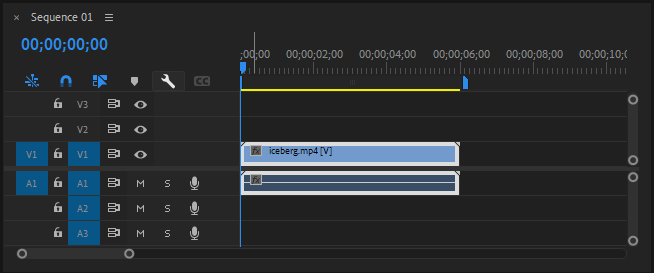- iceberg.mp4를 타임라인의 V1 트랙에 배치