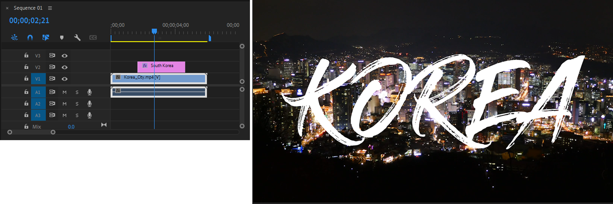 - Korea_City.mp4를 타임라인의 V1 트랙에 배치
