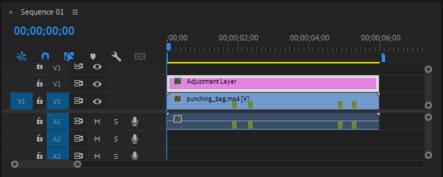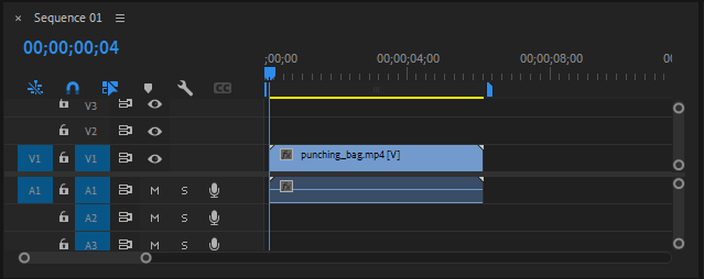 - punching_bag.mp4를 타임라인의 V1 트랙에 배치