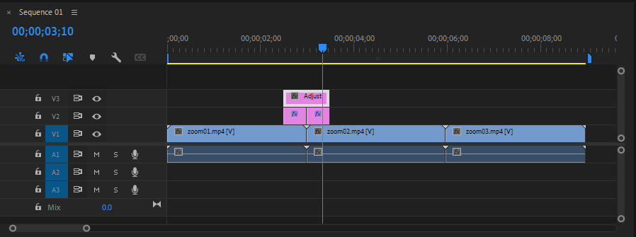 - V2, V3트랙의 모든 Adjustment Layer 클립을 복제하여 zoom02.mp4와 zoom03.mp4의 중간지점에 배치