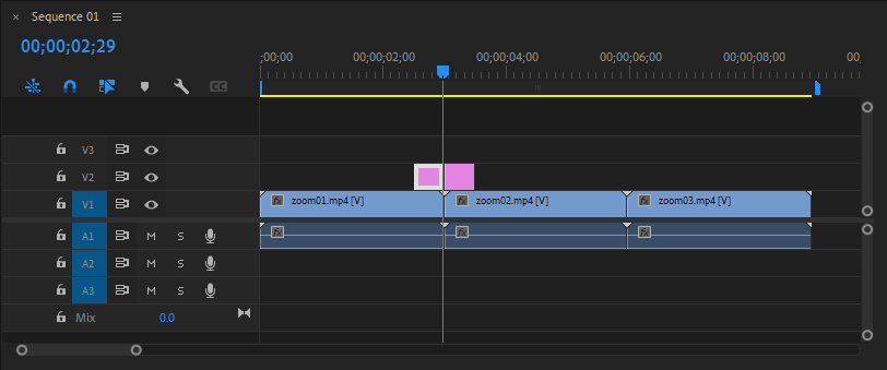 - zoom01.mp4와 zoom02.mp4, zoom03.mp4를 타임라인의 V1 트랙에 순서대로 배치